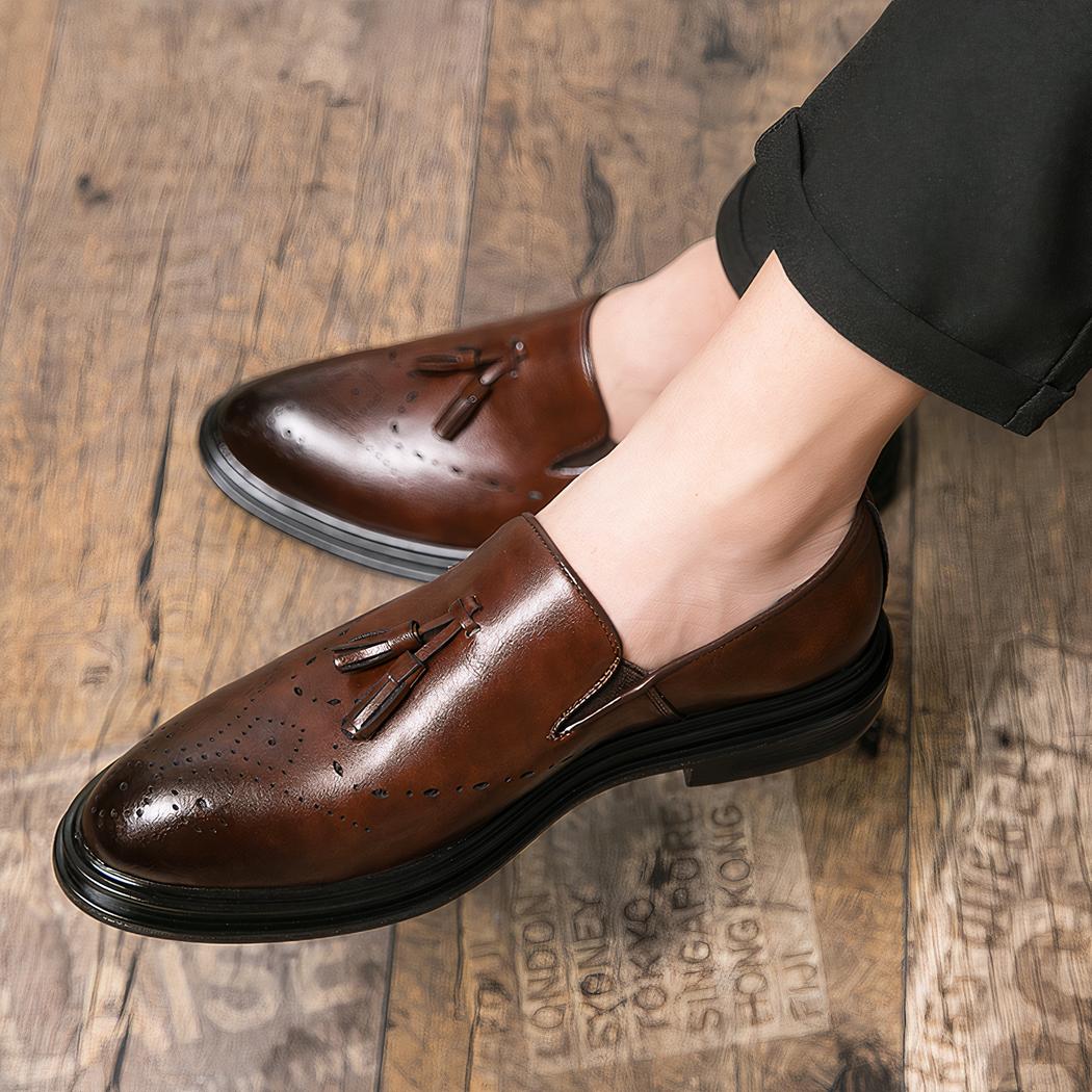 Nuestros mocasines clásicos con borlas para hombre son el accesorio perfecto para cualquier ocasión formal o informal. Estos elegantes zapatos han sido diseñados con un meticuloso acabado en piel de calidad superior y ofrecen un confort óptimo gracias a su forma ergonómica.
