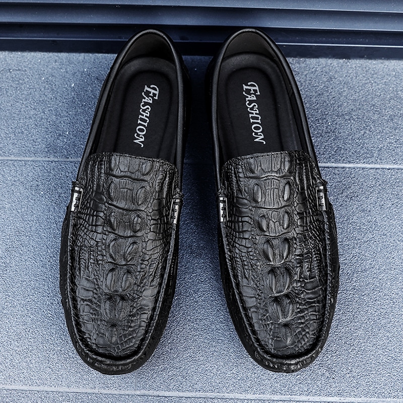 Enamórese de estas magníficas mocasines de piel sintética. Los discretos motivos de cocodrilo, mezclados con la piel, añaden un toque moderno a estos zapatos clásicos.
