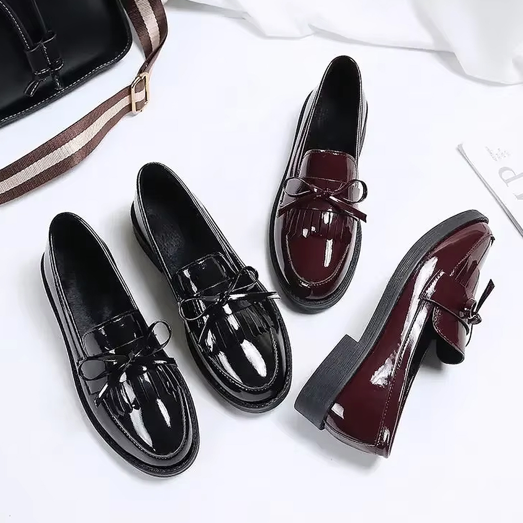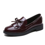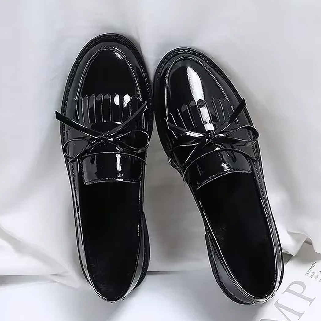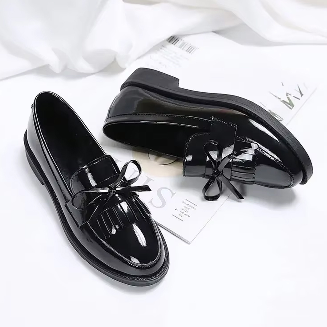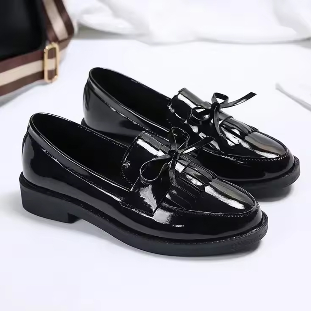 El brillante acabado de charol de este mocasín capta la luz y añade un toque de glamour a cada paso. Los delicados flecos y el lazo añaden un toque extra de encanto, creando el equilibrio perfecto entre lo clásico y lo atrevido.